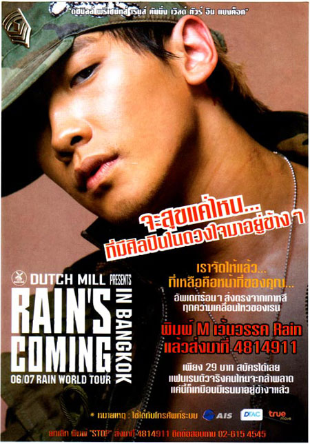 ![]() | "เรน" หนีระเบิดเลื่อนคอนเสิร์ตกระทันหัน โดย ผู้จัดการออนไลน์ 9 มกราคม 2550 15:53 น. จากคอนเสิร์ต เรน คัมมิ่ง ต้องกลายเป็น เรน โนคัมมิ่งซะแล้วสืบเนื่องจากเหตุการรณ์ระเบิดที่ผ่านมา เรน นักร้องหนุ่มแดนโสมจึงขอหลบระเบิดเลื่อนคอนเสิร์ตที่กำลังจะเกิดขึ้นต้นเดือนหน้าออก ไปก่อน จากเกิดเหตุการณ์ระเบิดหลายจุดทั่วกรุงเทพ ไม่เพียงส่งผลต่อประเทศในหลายๆด้านเหตุการณ์ครั้งนี้ยังส่งผลให้ ชอง จี ฮุน หรือที่รู้จักกันในนามของ "เรน" กับคอนเสิร์ตที่กำลังจะเกิดขึ้นของเขาต้องถูกเลื่อนออกไป ทางบริษัท อาร์ เค มีเดีย โฮลดิ้ง จำกัด ( มหาชน ) ผู้จัดคอนเสิร์ตของเรนในครั้งนี้ ได้รับข่าวร้ายจากทางสถานฑูตเกาหลีที่ระงับการเข้ามาประเทศไทยของเรน นักร้องชื่อดัง ถึงแม้ว่าจะผิดหวังไปบ้างแต่ทางบริษัทก็เล็งเห็นความสำคัญและความปลอดภัยของตัวศิลปิ นเป็นหลัก จึงจัดให้มีการแถลงข่าวเลื่อนคอนเสิร์ตครั้งนี้ของนักร้องหนุ่มออกไป โดยทางบริษัทจะจัดการแถลงข่าวการเลื่อนคอนเสิร์ตครั้งนี้ในวันพรุ่งนี้ ( 10 ม.ค. ) เพื่อแถลงให้ทราบโดยทั่วกันเกี่ยวกับรายละเอียดทั้งหมด ที่ห้องประชุม ดิสคัพเวอร์รี่ คลับ ชั้น 3 สยามดิสคัฟเวอรี เซ็นเตอร์ การเลื่อนคอนเสิร์ตครั้งนี้ของนักร้องหนุ่มขาแด็นซ์สุดฮอต ส่งผลให้แฟนคลับที่รู้ข่าวบ้างแล้วบางส่วนถึงกับบ่นโอดครวญกันเลยทีเดียว "เสียดายค่ะ ที่รู้ว่าคอนเสิร์ตเรนต้องถูกเลื่อนออกไป จริงๆแล้วเหตุการณ์ที่เกิดขึ้นส่งผลมากก็จริงในสายตาต่างชาติแต่ว่าจริงๆแล้วมันไม่ม ีอะไรเลยค่ะ เข้าใจนะที่ต้นสังกัดคำนึงเรื่องความปลอดภัยไว้ก่อนแต่อย่างว่าค่ะ เรื่องระดับประเทศเราทำอะไรไม่ได้อยู่แล้ว" "จริงๆแล้วอัลบั้มนี้เรนก็แต่งตัวเหมือนทหารนะคะ น่าจะมาไทยนะจะได้เข้ากับกระแสตอนนี้พอดีเลย แอบกลืนไง หวังว่าจะมีคอนเสิร์ตของเรนเร็วๆนี้นะคะ" ส่วนรายละเอียดเกี่ยวกับคอนเสิร์ตครั้งนี้จะเป็นอย่างไรจะกลับมาแจ้งให้ทราบกันอีกภา ยหลัง! from:Bi"s Kingdom |